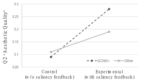 Age is the most significant risk factor for decline in cognitive functions, such as attention, working memory, processing speed, and verbal and visual explicit memory [45]. Two strong indicators of age-associated cognitive decline are SCD, which refers to self-reported decline [46], and difficulty with spatial navigation [45,47,48]. Cerman et al. reported that 68% of subjects with SCD complained about their spatial navigation abilities [49]. Thus, for older adults, visual stimuli that do not capture attention properly may not be fed to working memory from sensory memory. Thus, salient design promotes faster recognition of road signs and landmarks, supporting spatial navigation. Therefore, we hypothesized that older adults with SCD would be particularly likely to prefer designs produced with saliency feedback compared with other demographic populations.