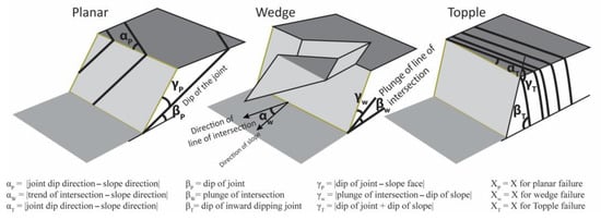 Kinematic analysis is commonly performed by the ‘Markland’s test’ to determine the possibility of planar, wedge, and topple failure modes in rock slopes [10]. It is traditionally performed by interpreting projections of joints and slope orientations on a stereonet [23,24,25,26,27,28,29]. The feasibility of a particular type of failure (i.e., planar, wedge, or topple) at a particular morphological setup is determined by the orientation of discontinuity planes, their interaction with each other, and the slope face of the topography. Figure 1 demonstrates the angular relations of discontinuity planes with the planar slope surface along with the notations used afterward. According to Markland, a planar discontinuity in a rock slope is susceptible to failure when the strike of a joint plane is parallel or sub-parallel to the strike of the slope face ( and , i.e., the joint daylights on the slope face and friction angle of the joint plane is less than the dip of the discontinuity. Here, is the joint friction angle, and is the inclination of the slope. These notations for and are used henceforward. A wedge can be formed with the intersection of two non-parallel discontinuity surfaces. If the plunge of the line of intersection is in the slope direction (i.e., ) and (see Figure 1), there is a higher possibility that the wedge will fail. A topple failure may occur along a steeply inwards dipping joint whose strike is nearly parallel to the slope face (). An interlayer sliding between the rock columns may occur if , paving the possibility for flexural topple.