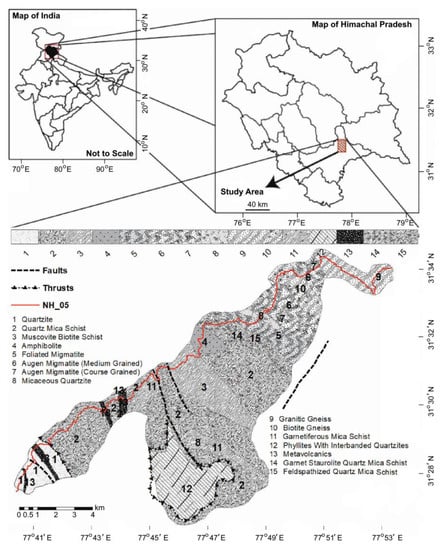 The study area for evaluating modified kinematic susceptibility analysis was chosen to be a highly landslide-prone zone of the Himalayas, partly situated in the district Shimla and partly in the Kinnaur of Himachal Pradesh, India. The analysed rocky terrain covers an area of 102 km2 and possesses various geostructural defects like joints, faults, and thrusts. The Himalayas, being a classic example of a continent–continent collision, comprises two distinct tectogens separated by the Main Central Thrust (MCT). These are the lesser Himalayan tectogen and Tethys Himalaya or higher Himalaya tectogen, with distinct geological histories. The area is situated in the lesser and higher Himalayas region and consists of rocks from the Jutogh formations [68]. This Jutogh nappe tectonically overlies the autochthonous Rampur Group and Wangtu Gneissic Complex [69]. The Jutogh formation is allochthonous to parautochthonous, which has slid over the Jutogh thrust onto the Rampur series [70]. The Jutogh group of rocks has undergone tectonic detachment through ductile shearing [71]. Singh (1979) named this ductile shear detachment the ‘Jeori dislocation’ [68]. The area lies in the Larji–Rampur–Wangtu window zone of the Larji tectonostratigraphic domain [72]. In [21], a part of the Larji–Kullu window was studied, and it was shown that rock detachments accounted for 62% of the total landslide events between 1984 and 2015, among which rockfall, planar rockslide, and rock topple accounted respectively for 30%, 22%, and 10% of the total landslides. The higher percentage of landslides associated with rock failure indicates the dominance of structures as a controlling factor of mass movement in this Himalayan geo-morpho-tectonic setting. A National Highway (NH-05), which runs through the study area on the left bank of river Sutlej, has witnessed significant rock and debris slides in the past and is susceptible to various mass movements at present. Geologically, the area contains various rock types such as quartzites, schists, gneisses, and amphibolite. Detailed lithology and structures of the area collected through field observation and literature are illustrated in the geological map (Figure 2) [68,69,70,73].