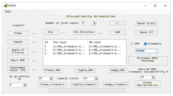 As mentioned in the above section, the input raster layers need to be exported into ASCII values using GIS software such as QGIS or ArcGIS before operating on GISMR. For discontinuities, a dip layer and a dip direction layer have to be prepared to represent the orientation of a single set of joints. Hence, a total of six layers (e.g., for joint 1 in Figure 6c,d) were prepared for three joint sets in the analysed area. The RMR layer, which is optional, needs to be prepared for a region of interest if the user needs to calculate SMR over a region. However, to maintain the objectives of this research, the analysis, and results for SMR are not included here. Other inputs, i.e., ASCII files of slope, aspect, and friction raster layers, were prepared and imported to GISMR to perform kinematic susceptibility calculations. There are options to input desired lateral limits for planar and topple failures. The lateral limit in kinematic analysis demarcates the boundary for failure enveloping. This analysis considers lateral limit values according to generally accepted values of 20 and 10 for planar and topple failure, respectively [78].
