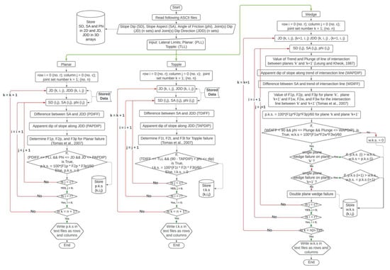 The computer application GISMR is programmed to perform calculations on a cell-by-cell basis for the kinematic susceptibility and SMR analysis. The program is written using C# on the visual studio Integrated Development Environment. GISMR takes inputs in ASCII/.txt formats, such as the slope, aspect, interpolated continuous dip and dip direction of each discontinuity sets, and friction angle, over a region to perform and produce results for kinematic susceptibility analysis. The program needs an ASCII/.txt file of the RMR value for calculating the Slope Mass Rating. After calculation, the program provides the outputs for kinematic or SMR results (as opted by the user) in .txt files. The calculation and evaluation of SMR using GISMR are chosen not to be included in this article to keep it concise and exclusive for kinematic analysis. Outputs from this application can be imported to GIS platforms such as QGIS or ArcGIS in raster format and visualised for presentation and further analysis purposes. In GISMR, there are options to produce results for planar and topple kinematic/SMR in separate layers for each of the joint sets and number of layers ( is the number of joint sets) for wedge analysis; there is one result layer for each possible intersection between different joint sets. The program has additional functions to produce a single susceptibility layer for each failure mode or for all failure modes. In this case, each pixel contains results of the maximum susceptibility value out of all considered result layers. Another useful algorithm in GISMR is “slope optimisation” which allows for the computation of optimum slope angle according to the user’s input of a susceptibility value that is considered safe for the analysed region. The optimum slope angle in this context means the maximum slope angle at a location that would not give rise to any kinematic failure. This function is especially programmed to aid the preliminary decision-making process for safe engineering construction in a mountainous region that involves threat from surficial failure or excavation, such as roads, dams, and buildings. A screenshot of the GISMR graphical user interface (GUI) showing all the input options and function buttons designed in the application is given in Figure 3, and the algorithm of the program is depicted in Figure 4.