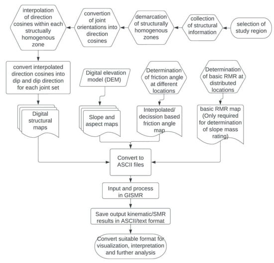 Kinematic stability assessment requires topographic information such as slope, aspect, and discontinuity orientation. To perform the calculations on a GIS platform, we need continuous information about slope, aspect, dip, and dip direction of discontinuities in a grid format. Topographic information can be easily derived from DEM, but there are challenges in preparing continuous gridded information of the dip and azimuth of discontinuities, i.e., a Digital Structural Model (DSM) [51]. For this purpose, we have implemented a procedure in which 3D orientation is converted into vector information using the tools built into GISMR. The conversion of orientations to vector information makes it feasible to work in 2D grid-based GIS applications. The entire algorithm of GISMR is based on a cell-by-cell calculation method using the information in gridded text format. The text files can be exported from the generated or derived raster files of slope, aspect, dip, and dip direction layer. Construction of DSM requires interpolation of the point orientation data collected through field survey or photogrammetric interpretation. Ideally, the zone(s) desired for interpolation should be geo-structurally homogenous, i.e., a sudden change in discontinuity orientation caused by fault, fold, lithological contact, or any other reason should not be expected inside the zone. Below, we describe the steps used to construct the DSM over the studied region successfully. The overall workflow of the analysis using GISMR is illustrated in Figure 5.