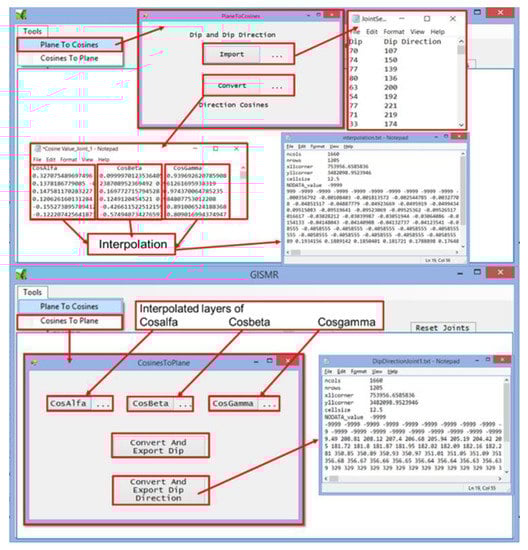 To ease the conversion process, a function was integrated into GISMR. The orientation data can be imported through an ASCII file, as shown in Figure 7 (top), to the ‘plane to cosines’ tool in GISMR, which can then be converted to direction cosines, as indicated in Figure 7 (bottom). Individual direction cosines can be interpolated on a GIS software such as ArcMap or QGIS. The tool ‘Cosines to plane’ can again be used to convert the interpolated grid text data to derive dip and dip direction in an ASCII file. The ASCII file can then be converted into a raster through GIS software to visualise the DSM. The pixel values must not go beyond the input data range for interpolating direction cosines. The value of and must be in the range of to , and the value of must lie in the range of to . The IDW interpolation was applied for this study to produce a continuous raster of direction cosines. The zone boundaries were set as barriers to the interpolation process so that the values are interpolated only within the smaller zones of geostructural homogeneity. Examples of interpolated dip and dip direction maps of joint 1 are shown in Figure 6c,d, respectively.
