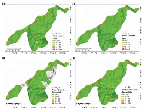 Kinematic susceptibility results (maximum value out of all the layers at each pixel) from the combined effect of all joint sets for (a) planar failure susceptibility; (b) topple failure susceptibility; (c) wedge failure susceptibility; (d) all modes of failure (combined) susceptibility.