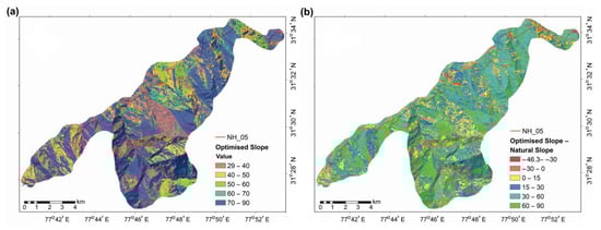 Results of slope optimisation: (a) the pixel value represents the slope value needed to maintain a kinematic susceptibility value of 50; (b) pixels with negative values need to be flattened by the amount subtracted from the slope angle. Pixels with a positive value may be steepened maximally by the amount indicated without compromising safety.