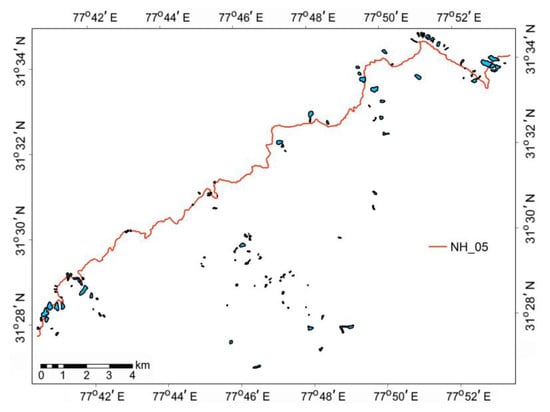 It is realised that manual collection of dense discontinuity information in the mountainous region is not always feasible due to the prevalence of inaccessible areas in a higher proportion. In these cases, particular photogrammetric techniques could be used to obtain geo-structural information as suggested by some researchers [54,74,75,76]. However, for the application and validation of the present methodology and algorithms, an area was chosen where sufficiently dense discontinuity orientation and geo-structural boundaries are available in the literature. The authors have also collected joint data along the National Highway 05 that intersects the study region. Proper methods and precautions were followed during the collection of discontinuity data for engineering applications [77]. Discontinuities are symbolically represented in geological maps where the dip amount is represented as a number (text), but the azimuth is represented as an oriented straight line. A Python script was written and implemented on the GIS platform to extract accurate orientations. A total of 357 discontinuities distributed over the regions were obtained from various pieces of literature [68,69,70,73]. Additionally, a stretch of approximately 35 km of National Highway 05, which runs through the selected area, was investigated to obtain 119 discontinuities’ orientations at various locations, making it a total of 476 in the whole region.