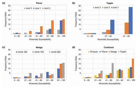 The frequency ratio was calculated for planar, topple, and wedge susceptible pixels and is represented in Figure 12a–d. It is observed from the column chart in Figure 12a that for each joint set in the planar failure, the frequency ratio is increasing towards higher susceptible classes. The case is similar for toppling and wedge failure susceptibility (Figure 12b,c). The result is also similar for FR analysis of the combined mode of failure susceptibility (Figure 12d), i.e., for all joints in each and all types of failures. Higher FR towards very high susceptibility class means a greater occurrence of landslides in highly susceptible regions. The very high susceptible class has an FR of 10.125, which means the frequency of landslide occurrence in this class is more than ten times higher than the average frequency of occurrence in the whole area.