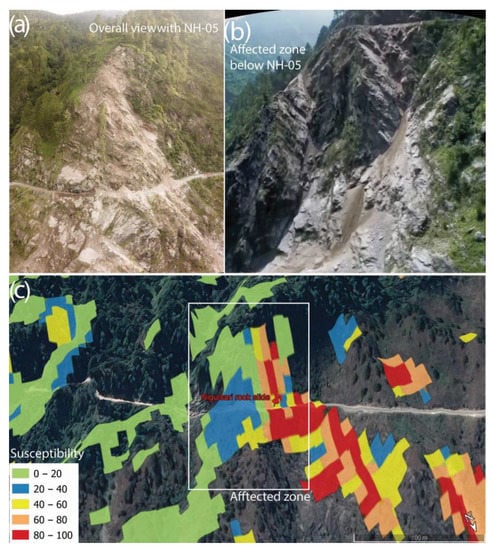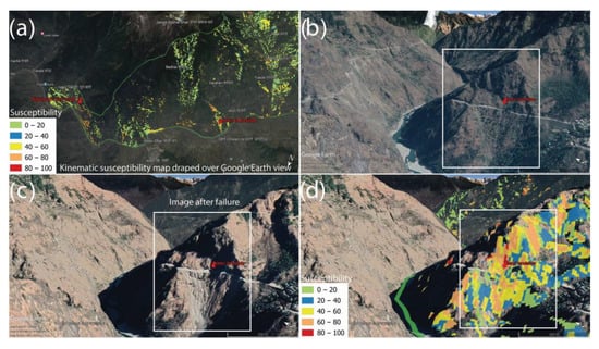 In 2021, the state of Himachal Pradesh has witnessed several perilous landslides, out of which two major landslides were reported along National Highway-05 in the study area [85,86]. One of the two incidents that happened in the Nigulsari region killed 28 people, buried several vehicles and ceased communication for a few days. Another occurred at Jeori with no reported casualties. Not to surprise, it was found that both regions fall in the zones/pixels of high to very high susceptibility. Figure 14a shows both the exact landslide location on Google Earth (GE) view overlaid with the kinematic susceptibility map produced prior to the event date [87,88]. Figure 14b,c shows the GE view of the region of the Jeori landslide before and after the occurrence, respectively. Figure 14d shows the susceptibility map draped over the GE view. It can be observed that the region is covered with orange and red pixels suggesting the slope is highly to very-highly susceptible to failure. Figure 15 shows the failed Nigulsari rock slope, which exhibits a shallow translational type of rock failure. The effect of the catastrophic landslide on the rock mass is shown in Figure 15a, where the exposed discontinuities arranged in a very unfavourable orientation make the slope highly susceptible to failure Figure 15b. It can be observed from Figure 15c that the Nigulsari landslide zone falls in the zone of high to very-high kinematic susceptibility.