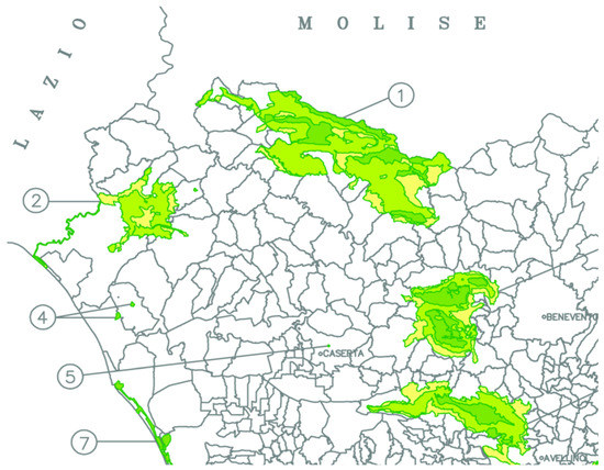 | Regional park | Area vulcanica Roccamonfina e foce Garigliano | 7 | 3 |