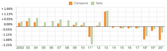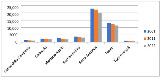 | Conca della Campania | 26.6 | 1392 | 1256 | −136 | −9.7 | 1159 | −97 | −7.7 |