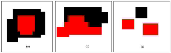 Figure 1. Urban expansion types: (a) Infilling expansion; (b) Edge expansion; and (c) Outlying expansion (black—existing development; red—urban growth).