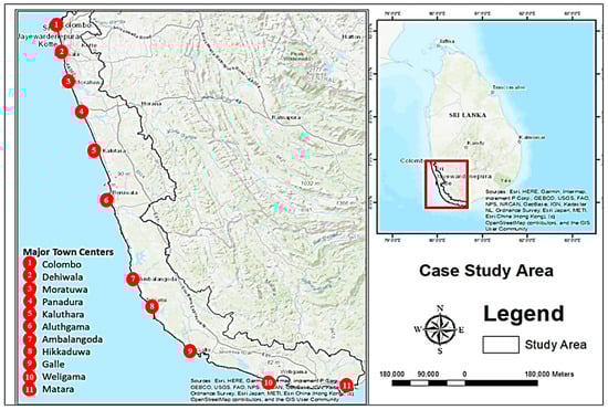 The Southern Coastal Belt of Sri Lanka, stretching between Colombo and Matara, was chosen as the study area of this research (Figure 2). The study selected this area because there are several town centers along the A2 coastal transportation route—including Colombo, Dehiwala, Moratuwa, Panadura, Kaluthara, Aluthgama, Ambalangoda, Hikkaduwa, Galle, Unawatuna, Aluthgama, Weligama, and Matara. The study area covers two main provinces—i.e., Western and Southern, where these provinces are one of the administrative units used in Sri Lanka [48]. Having such prominent urban locations in a region (where the research team has access to the required datasets) provides a good opportunity for applying the novel multisource open geospatial big data fusion method to demarcate urban agglomeration footprints.