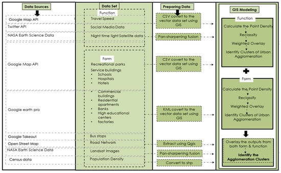 The multisource geospatial big data fusion approach uses different location-specific big data types collected from different sources [22]. This is to integrate such big data types to understand a considered phenomenon [23]. Recently, a study [24] used a multisource big data fusion approach to evaluate the polycentric urban form of cities. For that, they have used Night Time Light (NTL) data, Point of Interest (PoI) data, and Tencent Migration Data (TMG) as the big data sources. Further, another study [20] used Weibo’s Application Programming Interface (API) to obtain data, an online service that has emerged in China in recent years. Therein, the authors identified urban agglomeration trends following the connection strength and user numbers, which the urban form-related parameters—population and road density—were used to identify urban agglomeration were ignored.