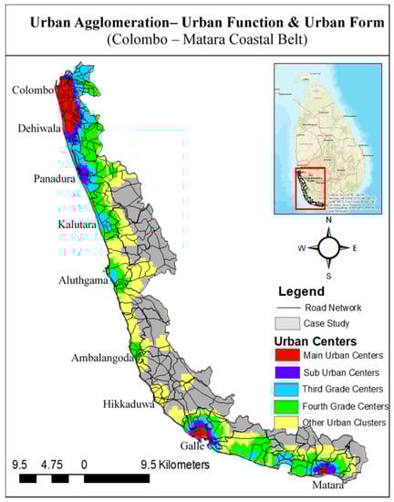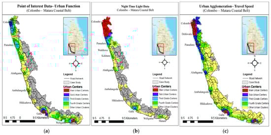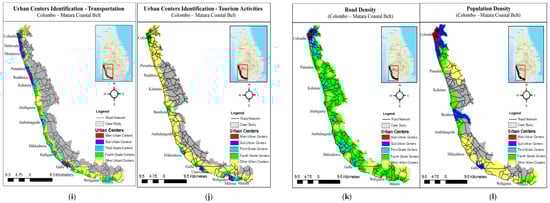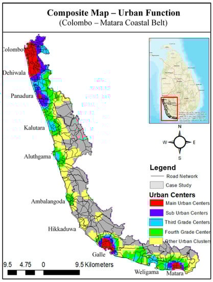 According to the travel speed, three main urban centers were identified. They are the Colombo, Galle, and Matara main urban centers. Colombo’s main urban center extends from Colombo to Dehiwala, performing a linear agglomeration along the A2 coastal road, creating an urban region from Colombo to Kalutara where Colombo and Panadura act as the main urban centers. Figure 7 shows the composite output of the considered parameters under urban functions.
