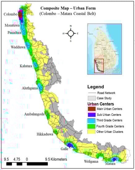 According to the transportation networks, main urban centers were identified in Colombo, Dehiwala, Moratuwa and Panadura, and the identified suburban patches were Kalutara and Ambalangoda. The composite map of all those mentioned above urban form-related parameters is provided in Figure 5. The identified urban centers and the urban expansion types are presented in Table 7.