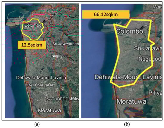 As of Figure 5, three main agglomeration footprints were identified. They are Colombo’s main urban center-based urban agglomeration footprint (12.5 km2), Galle’s suburban center-based urban agglomeration footprint (10.34 km2), and Matara’s suburban center-based urban agglomeration footprint (4.64 km2). Among them, Colombo’s main urban center-based urban agglomeration region is prominent and experiences a widespread agglomeration. This area can be identified as an urban region with multiple nuclei from Colombo to Kalutara. It consists of all kinds of urban centers. For instance, the main urban region spread along the coastal road from Colombo to Kalutara connects third-grade urban centers, i.e., Moratuwa, Panadura, Kalutara, and fourth-grade urban centers, i.e., Wadduwa, Ambalangoda. Further, the multiple nuclei urban patches in the region are experiencing an infilling urban expansion by converting non-urban areas from green areas into urban built-up areas.