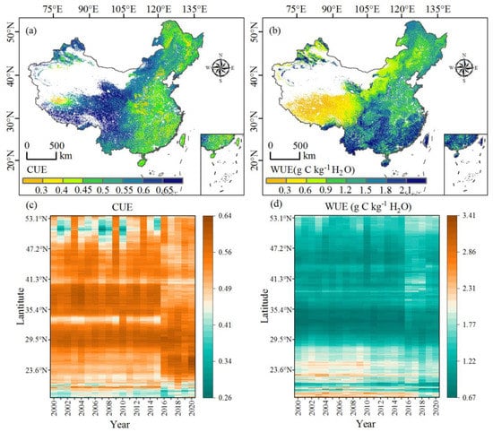 Spatial–distribution and latitudinal-variation characteristics of CUE and WUE in China from 2000 to 2020. (a,b) Spatial–distribution characteristics of CUE and WUE, (c,d) Latitudinal-variation characteristics of CUE and WUE.