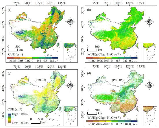 The g trend of CUE and WUE in China and the layers passing the significance test. (a,b) is the trend of CUE and WUE, (c,d) is the trend chart of CUE and WUE passing the significance test.