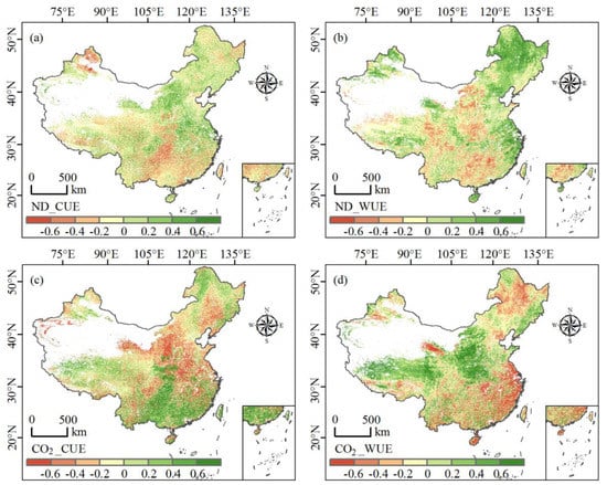 Contributions of ND and CO2 to CUE and WUE show significant spatial differences (Figure 5). The positive contribution of ND to CUE accounted for 48.1% of the total area, mainly in the northern region, and the positive contribution of CO2 to CUE accounted for 45.8% of the total area, mainly in the southern region. Fifty-six percent of the total area of the region where ND contributed positively to WUE was mainly distributed in the northern region, and the region with a positive contribution of CO2 to WUE accounted for 50.1% of the total area, mainly in the Qinghai–Tibet and northern regions.