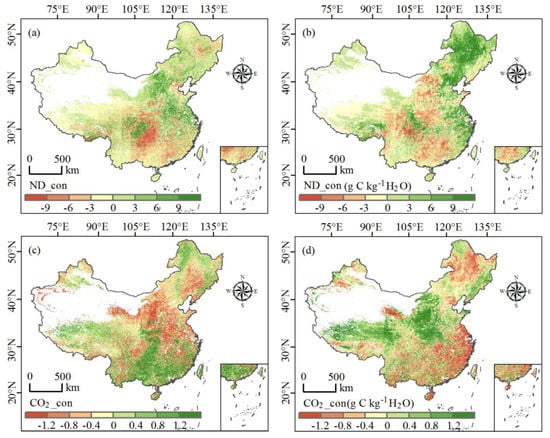 Among them, represents the linear trends of nitrogen deposition [36] and represents the impact of ND on CUE from 2000 to 2020. To compare the impact of other drivers on CUE, Equation (6) was also applied to the sensitivity and long-term trend estimates of annual mean ND, CO2, and Resi. Therefore, Formula (6) can be further rewritten as [37]: