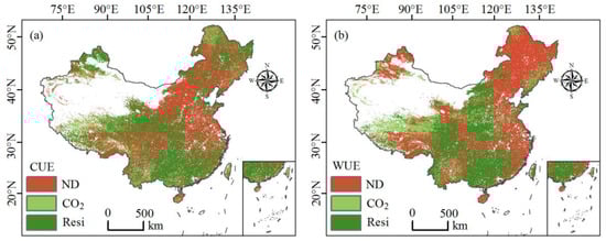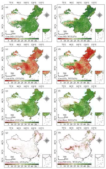 To determine the main factors controlling the variation of CUE and WUE in China, here, we considered the effect of the residual factors on CUE and WUE. As shown in Figure 6, among the effects of the three factors on CUE, the areas dominated by ND_con, CO2_con, and Resi_con accounted for 43.9%, 12.7%, and 43.4% of the total area, respectively (Table 2). It shows that ND is the main factor affecting the change of CUE; ND mainly controls the CUE in the north and northwest regions. In addition, the influence of CO2 on the CUE in the Qinghai–Tibet region is very important. As far as WUE is concerned, the areas dominated by ND_con, CO2_con, and Resi_con account for 50.9%, 14.1%, and 35% of the total area, respectively (Table 2). ND has the largest control area of WUE in the entire region, and CO2 controls WUE mainly in the Qinghai–Tibet region.