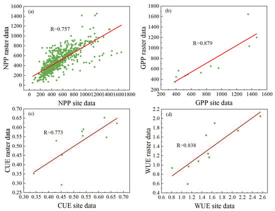 Scatter plots of the NPP, GPP, CUE, and WUE site data and MODIS raster data. (a) is the scatter plots diagram of NPP site data and raster data; (b) is the scatter plots diagram of GPP site data and raster data; (c) the scatter plots diagram of CUE is calculated from the site data and raster data; (d) scatter plots of WUE calculated from site data and grid data raster data.