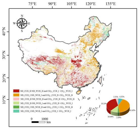 In all categories, the areas where ND increases CUE and WUE while CO2 reduces CUE and WUE are mainly distributed in the northern region, accounting for the largest proportion at 41.65% (Figure 9). For areas where ND has a positive effect on CUE and WUE, the CO2 shows a negative effect on CUE and WUE. As soil-nutrient concentrations increase due to ND, transpiration decreases to match the effectiveness of nutrient mass flow caused by reduced stomatal conductance [22]. The areas where ND and CO2 have a positive impact on WUE is larger than the area where both of them have a positive impact on CUE (Figure 10). ND induced increases in LAI increases canopy transpiration, resulting in decreased soil evaporation [57]. Therefore, the effect of ND on GPP is greater than that of ET, which is consistent with the finding that the combined effect of CO2 fertilization and N addition on WUE is greater than the effect of CO2 alone [23,24,25,26,27,28,29,30,31,32,33,34,35,36,37,38,39,40,41,42,43,44,45,46,47,48,49,50,51,52,53,54,55,56,57,58]. The areas where ND reduces CUE and WUE while CO2 increases CUE and WUE are mainly distributed in Qinghai–Tibet and southern regions, accounting for 35.33% (Figure 9). In areas where ND has a negative effect on CUE and WUE, the CO2 shows a positive effect on CUE and WUE. It shows that ND and CO2 have an interactive relationship, and the affected area accounts for 76.98% of the total area.