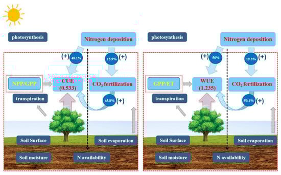 In recent years, the increase of CO2 concentration, temperature [7,8], drought, and other climate changes have seriously affected the carbon and water exchange of terrestrial ecosystems [9]. CO2 fertilization can regulate the carbon allocation of the biomass of each component of the vegetation and change the demand for autotrophic respiration (Ra) of the vegetation, thereby increasing the CUE [10,11]. In addition, nitrogen deposition (ND) also affects the CUE [12,13]. More and more studies show that CUE changes with the changes of vegetation type, climate, nitrogen deposition, and other factors [14,15]. The eco-physiological characteristics of leaves show that WUE increases with an increase in atmospheric CO2 concentration, which is called the “CO2 fertilizer effect” [16,17]. Increasing the CO2 concentration increases WUE by decreasing transpiration rate [18]. On the leaf scale, WUE depends on the supply of water and nitrogen in addition to the CO2 in the atmosphere [19]. ND is an important factor in promoting WUE [20,21]. An increase in ND decreases stomatal conductance, leading to reduced transpiration, and its influence on the total primary productivity (GPP) determines the change in WUE [22,23,24]. ND and CO2 have an important influence on CUE and WUE, however, it is still unclear how much of an impact they have on CUE and WUE. Therefore, it is necessary to quantitatively evaluate the impact of ND and CO2 fertilization on CUE and WUE.