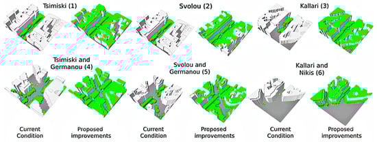 The comparison visualizations revealed that the greatest improvement was shown by P.P. Germanou at the intersections with A. Svolou and Tsimiski, particularly where additional trees are planted. The significant effect of sun and shade on thermal comfort was well documented in the relevant literature, so this came as no surprise. Tsimiski and A. Svolou already had significant tree cover on the sidewalks, and improvements in thermal comfort were more limited. They came mainly from the improvement of the thermo-optical properties of the materials, the denser tree cover, and, to a lesser extent, from the planted roofs. In the case of the recently pedestrianized Kallari St., there was some potential for further but limited improvement for the examined intervention scenario. It seemed that additional shading of the road, by natural or artificial means, was required to increase its bioclimatic responsiveness toward the expected increase in frequency and intensity of heat waves in the coming years.