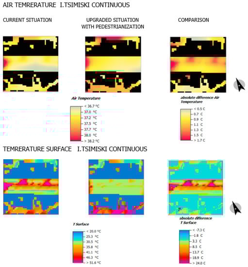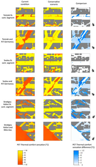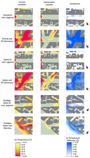 The proposed interventions resulted in an air temperature drop of approximately 1 °C (from 39.5 °C to 38.5 °C) in the cases of P.P. Germanou St. and Nikis Avenue, although changes were smaller or negligible in other streets. The air temperature was relatively inelastic to local environmental improvements due to the constant mixing of air masses within the urban canyons. Air mixing seemed to occur in the narrower local streets of Konstantinou Palaiologou, Spyrou Loui, Iktinou, Morkentau, and L. Margariti as well, which share similar air temperatures. The effect was more noticeable in areas with significant improvement potential, especially where sun-exposed asphalt prevails (Figure 5 and Figure 6). The center of street junctions could be a particularly problematic area (e.g., the P.P. Germanou St. intersections with Svolou St. and Tsimiski St.).