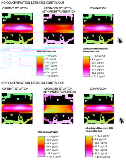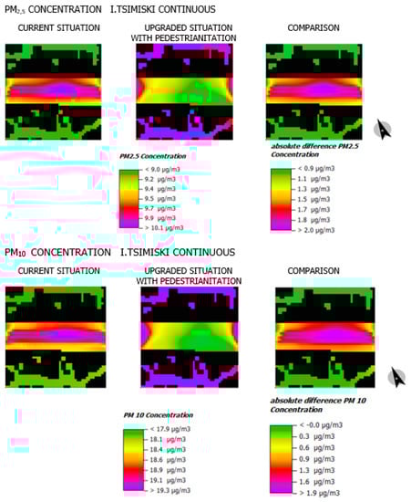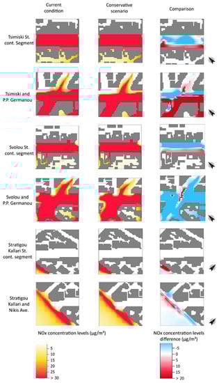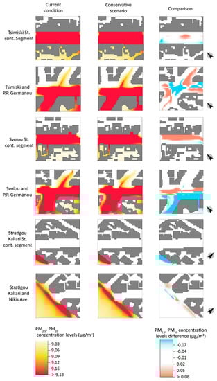 Air quality is an important parameter to consider in environmental design, as higher tree cover can increase the concentration of air pollutants on urban streets. Therefore, environmental interventions must be accompanied by a framework of calming traffic regulations [] that mitigate gaseous pollutants in the city. It is noteworthy that following the simulated pedestrianization scenario, the nitrogen oxides were reduced by 87% due to the total traffic prohibition. Nevertheless, the decrease of the fine particles (PM2.5) and the coarse particles (PM10) was only 8.5% and 6.5%, respectively, because they are mainly produced by industries, marine aerosols, dust, fires, fly ash, and households, and not by cars.
