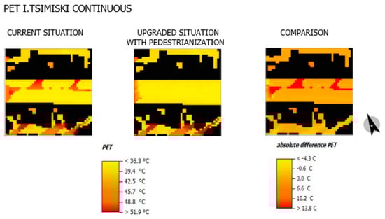 The results reveal the influence of the relative lack of tall vegetation in P.P. Germanou St. and Nikis Avenue and the complete lack of vegetation in several local streets (Konstantinou Palaiologou, Iktinou, and Spyrou Loui) on increased thermal stress (Figure 4). In such cases, the improvement of PET thermal comfort sensation was significant under vegetation shade when considering the intervention scenario. The biggest reductions in perceived air temperature were recorded in P.P. Germanou St. and Nikis Avenue and could reach 12 °C under shade. On the other hand, Stratigou Kallari St., which has recently been pedestrianized, and Svolou St. showed negligible improvements in PET thermal comfort sensation due to the fact that they were already shaded significantly by trees. Here it is noted that the trees for all cases were simulated at mature height, including the newer trees planted in Stratigou Kallari. Tsimiski St. demonstrated moderate improvement of around 7 °C on average due to the street already having a row of trees on both sidewalks. Yet, even with two rows of trees, portions of asphalt received little shade (Figure 6). It was also found that despite the beneficial effect of the sea breeze at the coastal Nikis Avenue, the lack of shade from trees and structures significantly increased the feeling of thermal discomfort.