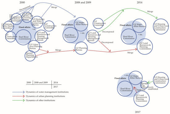 The local Guangzhou government witnessed reorganizations in 2008, 2014, and 2017, which caused long-term impacts even on how flood affairs are managed recently (Figure 2). The following section discussed them in detail on account of organization adjustments, driving forces, and the resulting impacts.