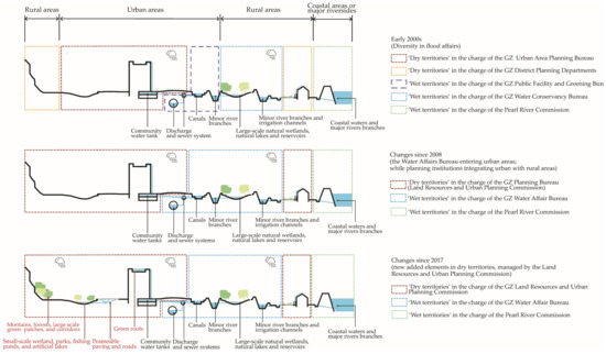 There are, of course, exceptions. In the preparation for the 2010 Asian Games in Guangzhou, two artificial lakes (Haizhu Lake and Baiyun Lake) were planned and constructed around 2010 to improve the urban environment [34]. These pilot projects are natured-based solutions to store rainwaters jointly managed by the Water Affairs Bureau and Urban Planning Bureau across ‘wet territories’ and ‘dry territories’, concerning the construction and maintenance of lakes, canals, pump stations, and the land adjustment and land acquisition due to water infrastructures.