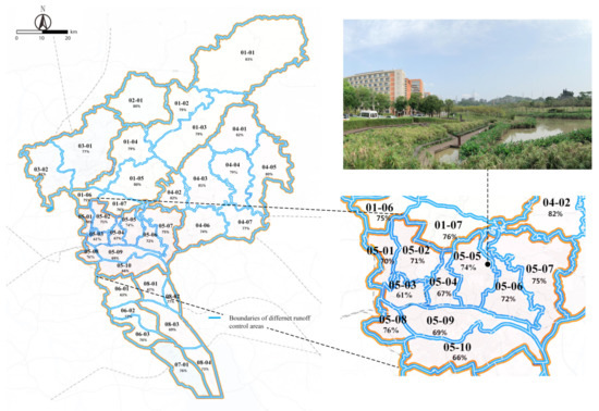 Regulatory tools have also been developed in spatial planning to implement these nature-based solutions [32]. Figure 4 gives an example of how, according to the Guangzhou Sponge City Plan, urban planning is supposed to use run-off control regulatory codes to ensure permeable landscapes and limit impermeable surfaces in urban development. These codes specify the amount of rainfall that has to be stored on every plot of land. For instance, in area code 05-05, 74% of the rainwater has to be retained and only 26% can flow directly into the drainage system. Nature-based permeable solutions have a higher capacity to hold water than impermeable roofs, roads, and paving. Thus, building density is strictly controlled and open spaces are reserved to reach the targets of these regulatory codes.
