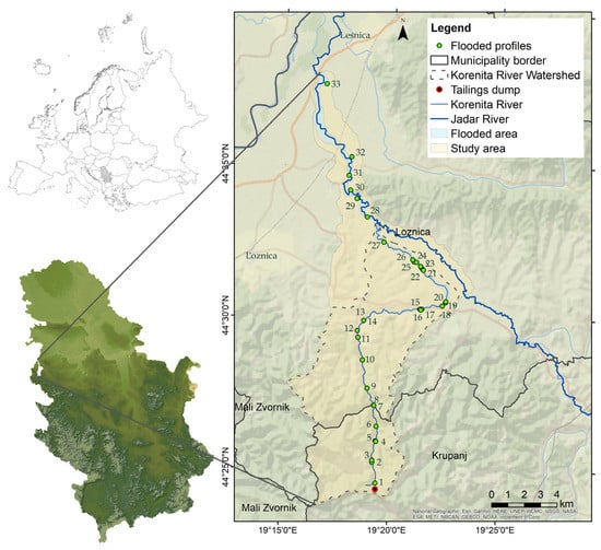 The study area (Figure 1) is a flooded area from the flotation tailings of the former antimony mine located in Western Serbia, in the town of Kostajnik, along the Kostajnica river and part of the alluvial plain of the Jadar river, 44°23.830′ and 44°38.100′ N and 19°15.350′ and 19°23.750′ E. The Jadar river basin has been the potential location for the opening of a new mine for lithium extraction for the past 20 years after the discovery of “jadarite” [42]. Although the antimony mine has been closed for more than three decades, it was active since 1882 and closed in 1987 [6], its impact is visible both due to the increased content of PTEs from mining and smelting, as well as from additional problems caused by the flood and spillage of tailings material in 2014. On that occasion, the tailings slurry contaminated a 27 km length of riverbeds and 360 hectares of agricultural land [14].
