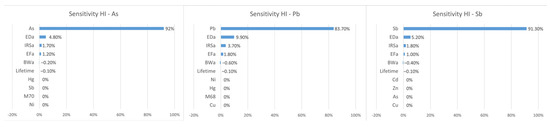 Based on the mean value of lower than 1, the non-carcinogenic hazard (HI) does not exist for any of the elements. However, the mean HI value calculated for As is the limit value (0.99), and the non-carcinogenic hazard is especially high for As, Pb and Sb when the maximum calculated values of the HI index are analysed (Table 6). Based on the sensitivity analysis, the effects of certain parameters on the non-carcinogenic risk for As, Pb and Sb were determined (Figure 9), where the risk is most affected by element concentration (83.7–92%), followed by exposure (ED) 4.8–9.9%.