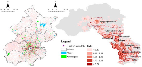 This paper empirically investigates the formulation mechanism of urban intensity in Beijing and compares the status quo with the projection of a theoretically ideal FAR model. This work attempts to guide urban planning with quantitative theoretical and empirical analysis that endorse scientific rationality, echoing a long-established academic tradition in urban planning [58]. In particular, in terms of the planning for urban intensity, many attempts have been made to use geographic spatial analysis in the service of urban and regional science centered on location theory, such as applying linear regression analysis and urban growth models [59], the use of logistic regression to explain the importance of urban growth drivers [60], and the application of spatial econometrics to environmental and resource studies and planning [61]. In China, however, although urban planning has been primarily experience-based, quantitative methods have been gradually introduced in recent years, and attempts have been made to achieve rational planning [62]. To a large extent, one of the focuses of such attempts lies on the issue of urban intensity, as it is directly linked to “land finance” and is thus of particular importance in municipal governance [63]. Therefore, with cities in China generally initiating a new round of regulatory planning, rational designation of urban intensity in planning is necessary and urgent. We hope to present a deeper understanding of the formulation mechanism of urban intensity through Beijing’s case study to contribute to this ongoing endeavor from a rational perspective.