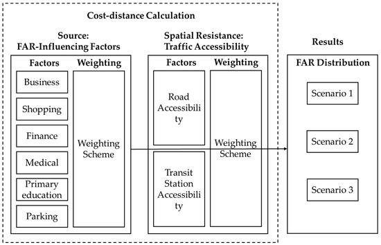 Meanwhile, based on applied economic geographical theories, we constructed models to set up scenarios of urban intensity distribution that are “theoretically ideal”. As a starting point, under the “featureless plain” assumption, population density could be used as a direct proxy for the FAR. Next, we loosened the homogeneity assumption and considered the factors that would “distort” the concentric circle-shaped intensity distribution. First, considering that the supply of public services is an essential element limiting the number of residents in a city, we introduced this indicator to correct the relationship between population density and FAR. Second, to simulate the distance-decaying service capacity of public services, we used the minimum cumulative resistance (MCR) [55] approach to introduce spatial resistance in public service provision. We took six types of public service POI, including business, shopping, finance, medical, primary education, and parking, as the source in the MCR model and set the resistance with the inverse of the average road travel speed and the walkable buffer zone of the subway stations (Figure 2).