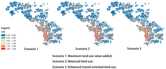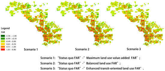 Overlaying the three “ideal” urban intensity scenarios with the status quo FAR distribution, the results are shown in Figure 4. Scenario 1, the maximum land use value-added scenario, has the smallest standard deviation among the three scenarios. Based on the scenario, shopping-related factors exhibit a higher contribution to urban intensity in the “ideal” model than in reality. In contrast, high-level roads, such as national, provincial, and county roads, positively contribute to urban intensity in the “ideal” model, probably because of their perceived role in enhancing the accessibility of public services. However, these variables negatively contribute to urban intensity in the empirical models. This finding indicates that the transit-oriented development strategy, although highly advocated for by the urban planning bureau [56,57], has not already shown prominent effects in reality.