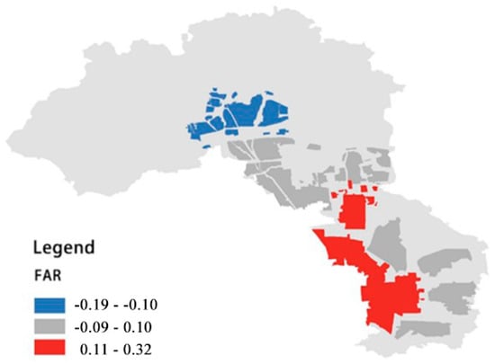 The regression coefficient between housing prices and urban intensity is positive, which may be explained by the trade-off between FAR and commuting/public service provision costs in classic location theories [31,33]. The positive correlation seems to imply that in the study area, the benefits of higher FAR in places with high housing prices are higher than the costs of increased provision of public services and commuting.