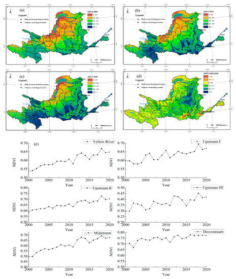 Spatio-temporal changes in the Yellow River basin from 2000 to 2020; (a–c) spatial distribution of NDVI values in the Yellow River basin in 2000, 2010, and 2020; (d) spatio-temporal variations of NDVI values in the Yellow River basin from 2000 to 2020; (e) NDVI variations of each division in the Yellow River basin from 2000 to 2020.
