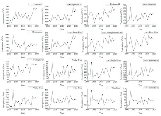 In the last 20 years, precipitation in the Yellow River Basin has shown a prominent increasing trend of 2.0 × 1010 m3 (converted into runoff according to precipitation) (Figure 4). The average annual precipitation increased by 23.6% in the middle reaches of the Yellow River, 6.6% the lower reaches of the Yellow River, 41%, in the upper reaches, 40.7% in area II, and 50.5% in area III. The precipitation in the main tributaries of the Taohe River, Huangfuchuan River, Kuye River, Wuding River, Yanhe River, Jinghe River, Beiluo River, Weihe River, Fenhe River, Yiluo River, and Qinhe River increased by 40.16%, 45.05%, 62.95%, 78.53%, 36.63%, 42.60%, 35.13%, 27.54%, 20.99%, 1.58%, and 5.89% respectively.