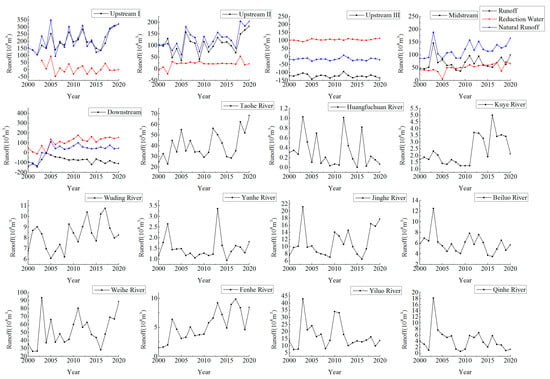 Dynamic changes in the runoff, reductive runoff, and natural runoff in the Yellow River basin; this figure includes the change in runoff in each division of the main stream and tributaries.
