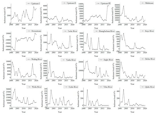 Dynamic changes in the sediment load in the Yellow River basin; this figure includes the change in sediment load in each division of the main stream and tributaries.