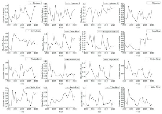Changes in the runoff coefficients of the main stream and tributaries of the Yellow River basin; this figure includes the change in runoff coefficients in each division of the main and main tributaries.