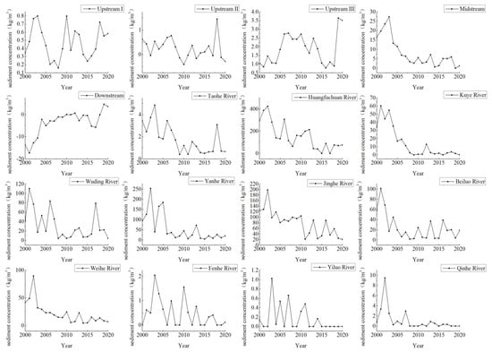 Changes in sediment concentration in the main stream and tributaries of the Yellow River basin; this figure includes the change in sediment concentration in each division of the main stream and tributaries.