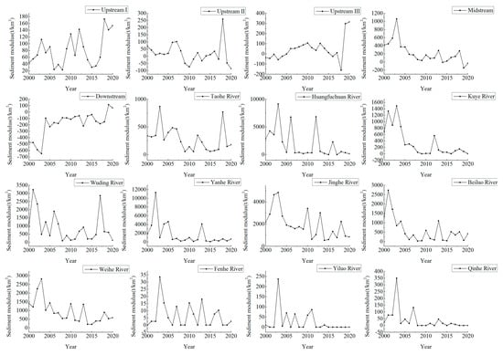 Changes in the sediment modulus in the main stream and tributaries of the Yellow River basin; this figure includes the change in sediment modulus in each division of the main stream and tributaries.
