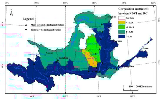Correlation coefficients between NDVI and the runoff coefficient in the Yellow River basin.