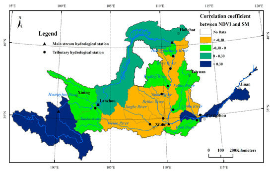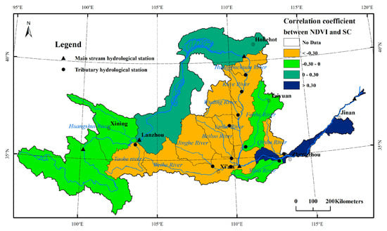 Correlation coefficients between NDVI and the sediment concentration in the Yellow River basin.